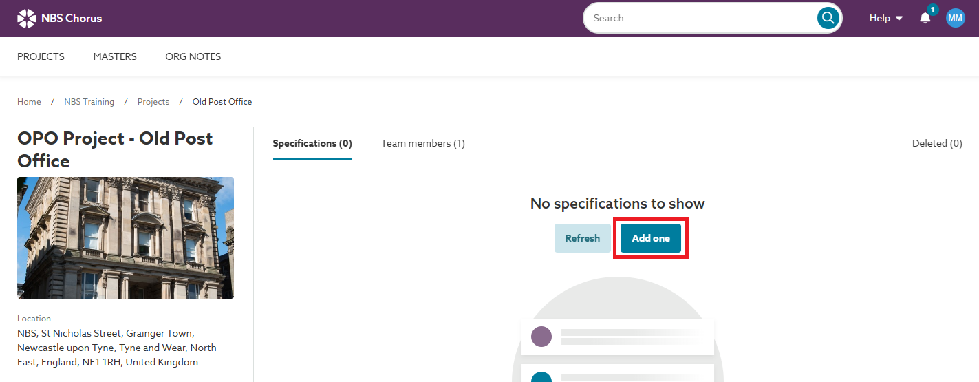 Once you have clicked on a Project, you'll be taken to the Specifications page.