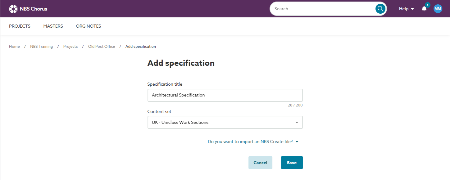You will then be required to enter a Specification title and choose a Content set (content sets which are not available with your subscription will be displayed with a grey font colour and cannot be selected).