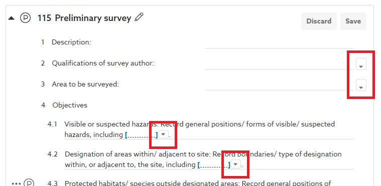 When editing clauses within your specification there may be pre-defined suggestion options available to select from a drop down button located at the right of some of the row value fields. The drop down button would be displayed similar to the examples shown below.