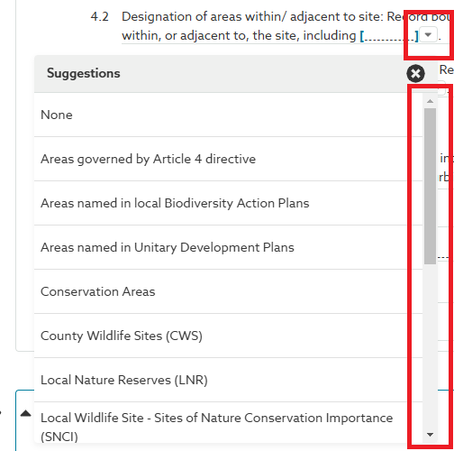 Click on the drop down button for the row, the suggestion options list will be displayed. If there are more suggestion options than can be displayed, you will see a vertical scroll bar displayed at the right of the list.