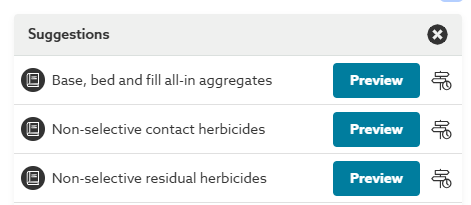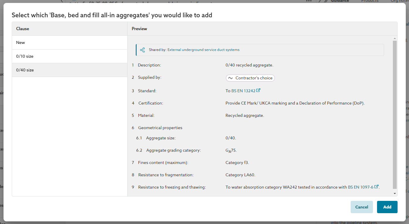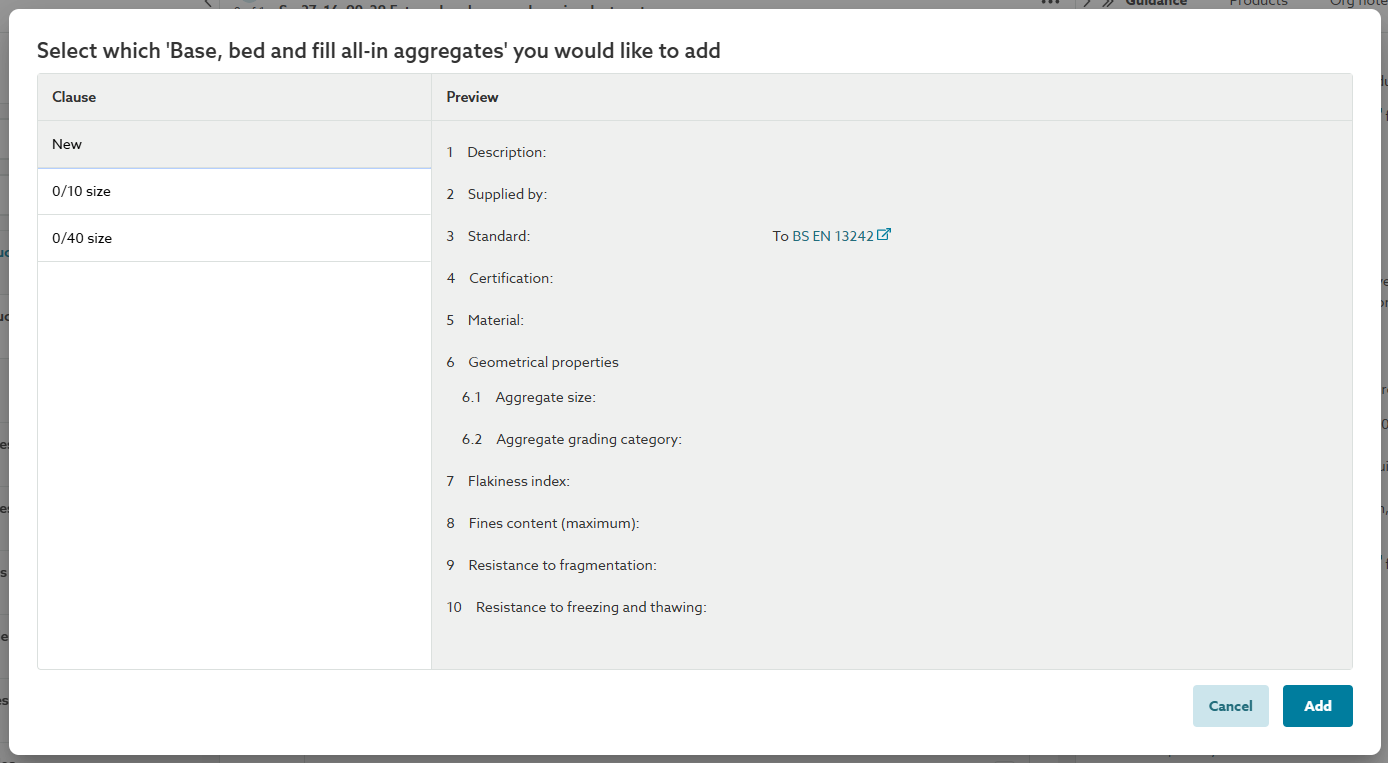 If the blue button has a title of 'Preview', this indicates that there no instances of this particular clause in the specification already. When the preview is displayed, click the Add button to add an instance of clause suggestion from the content set.