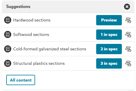 If you wish to view the content and structure for one of the clause suggestions, click on the blue button displayed at the right of the clause title in the list. The blue button will either have a title of 'Preview' or 'x in spec' (where x is a number).