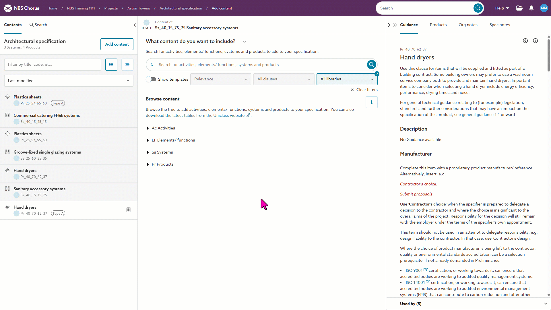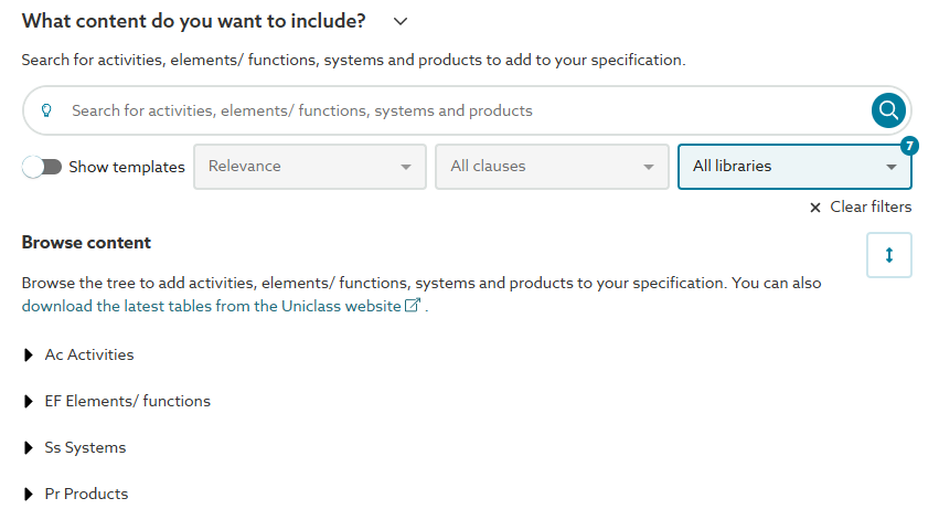 Content can be added to your specification either by entering a key word or phrase in the search facility, or by using the browse content tree view.