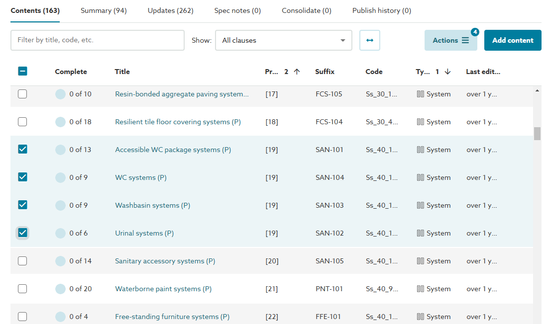 Please note: for AU/UK Uniclass Work Sections specifications. Any clause(s) linked to the content selected from the contents list will also be included automatically in the published/ exported document.