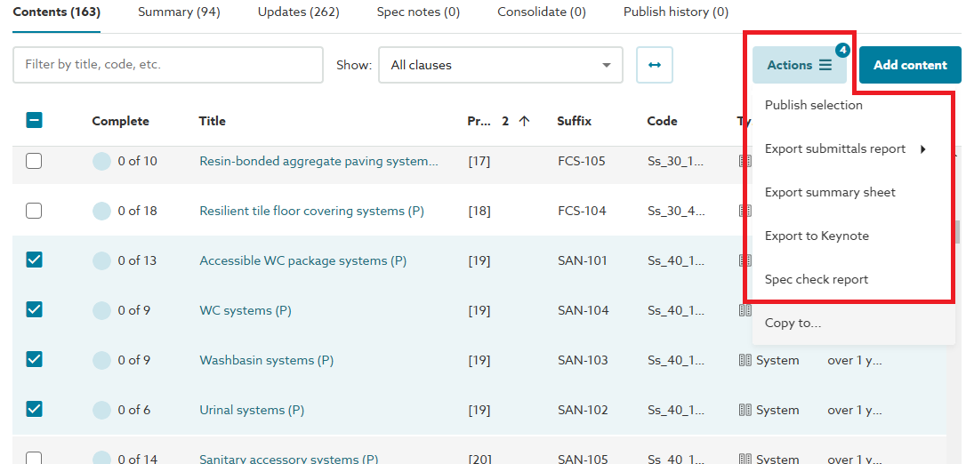If you wish to publish or export a defined selection of content from your specification, you can do this in the following way.