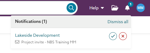 Clicking on the bell icon will display the title of the project the user is invited to and the name of the NBS Chorus Organization the project is located within. At the right-hand side are buttons to either accept or reject the invite: