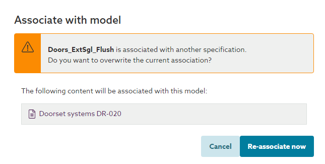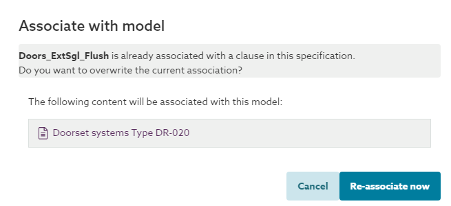 If confirmed (by clicking the Re-associate now button) the previous association will be broken and the type ID parameters in the object will be updated to match the new clause association. This would result in a model association error between the original spec and the model. Providing you have a designer (or above) role on the original specification, you would be able to identify and resolve the issue by navigating into the original model and spec, then scanning the model in the Model tab and reviewing the error in the Issues tab. - Associating an object which is already associated with something in a different spec you do not have permission to (i.e. you do not have a reader (or above) permission to the specification).