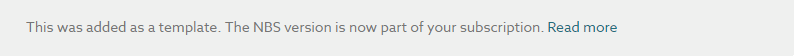 You will see the message, 'This was added as a template. The NBS version is now part of your subscription' in the editor when you have previously added content that was not included in your organization's subscription, and now it is included in the subscription.