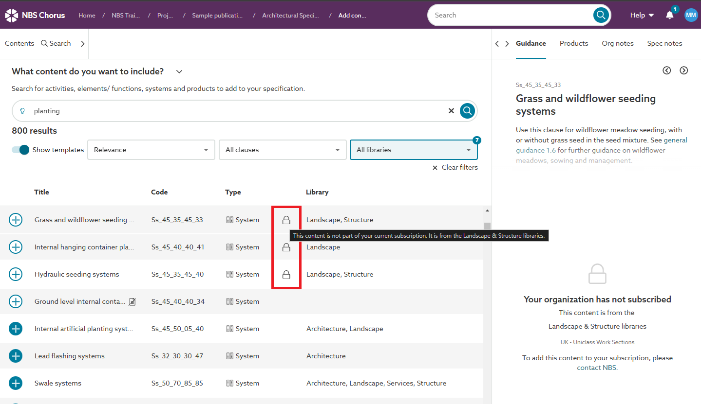 For example, in ‘UK - CAWS’, the content set has been subdivided into four libraries: Building, Early stage, Landscape and Small works. Section Q31 ‘External planting’ is allocated to the Building and Landscape libraries. If your organization does not subscribe to one of these libraries, you will see a Padlock icon in the search results.