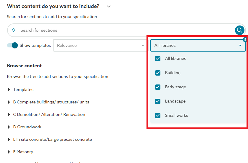 When you are searching/ browsing for content to add to your specification, you can filter out libraries. So if you only want to see results from the libraries you subscribe to and hide results with the padlock icon, you can do this.