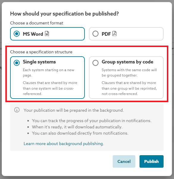 How such clauses appear in the published specification depends on the specification structure option selected. Please refer to the separate Publish by 'single systems' or 'grouped systems by code' support article for additional information on this option.