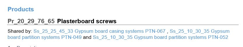 A shared clause is one that has been linked into two or more parent/ host clauses, for example, a Product clause for standard gypsum plasterboard that has been linked into a System clause for a gypsum board wall lining system and a System clause for a gypsum board partition system.