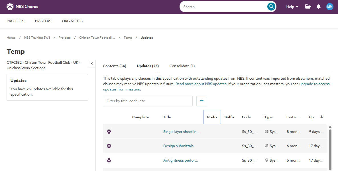 'Update' is used for updating projects in progress or masters. Updates are shown when there are updates to the technical information in platform. Updates may also be shown when articles or clauses that you have copied from a Master have been changed (these types of updates are referred to as 'Master Change Notifications').