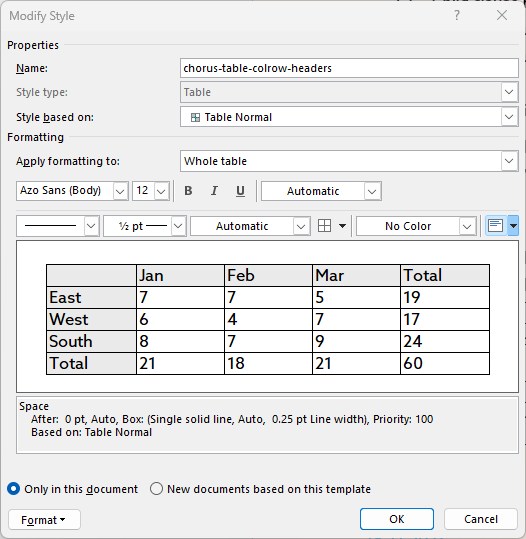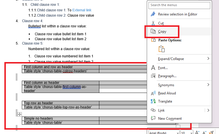 - Test your updated stylesheet. Publish from Lattura Spec/ NBS Chorus to test that tables are published using the desired table styling.