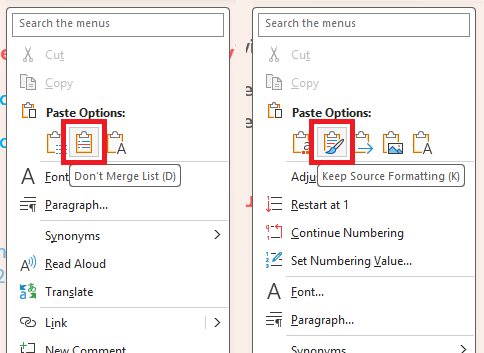 - On the right-click menu, under the 'Paste Options' heading, select either the 'Don't Merge List' or 'Keep Source Formatting' option. The option you see will depend on where you have right clicked in your stylesheet.