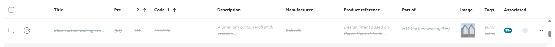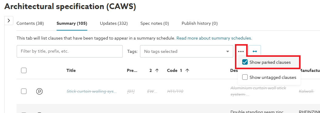 | Park button | For sectional content only. The park button next to each row in the Schedule grid lets you park or unpark the item. Parked content is shown 'greyed out' and scored through in the grid. ![]() To enable 'parked' content to be shown in the grid, ensure the 'Show parked clauses'/ 'Show parked articles' checkbox is ticked. This setting is accessed from the 3-dot menu button located above the grid. ![]() Related article: Parking unwanted information from your specification |