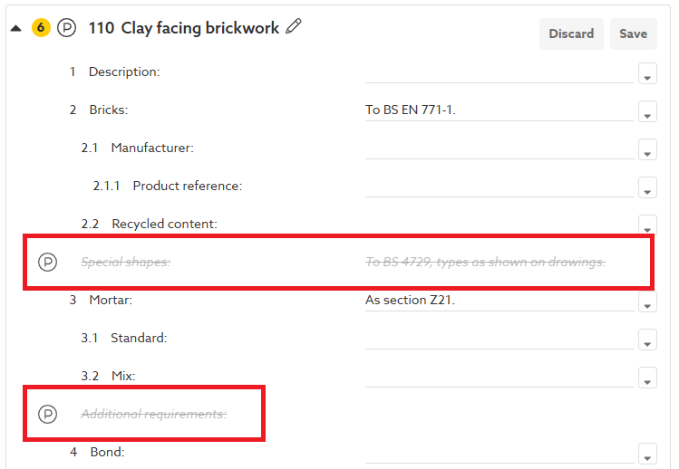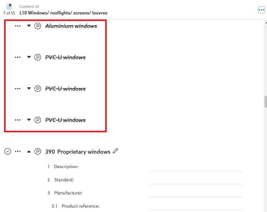 Within sectional content sets, you can park any articles or clauses within the section. Generally, this may be done for some of the pre-written specification content where it is not relevant to the particular specification you are producing. For example, in the UK CAWS work section 'L10 Windows/ rooflights/ screens/ louvres', there are clauses for Wood windows, Steel windows, Aluminium windows and PVC-U windows. If the project only has wood windows, you would complete the relevant clauses relating to the wood alternatives and park the clauses relating to steel, aluminium and PVC-U alternatives.