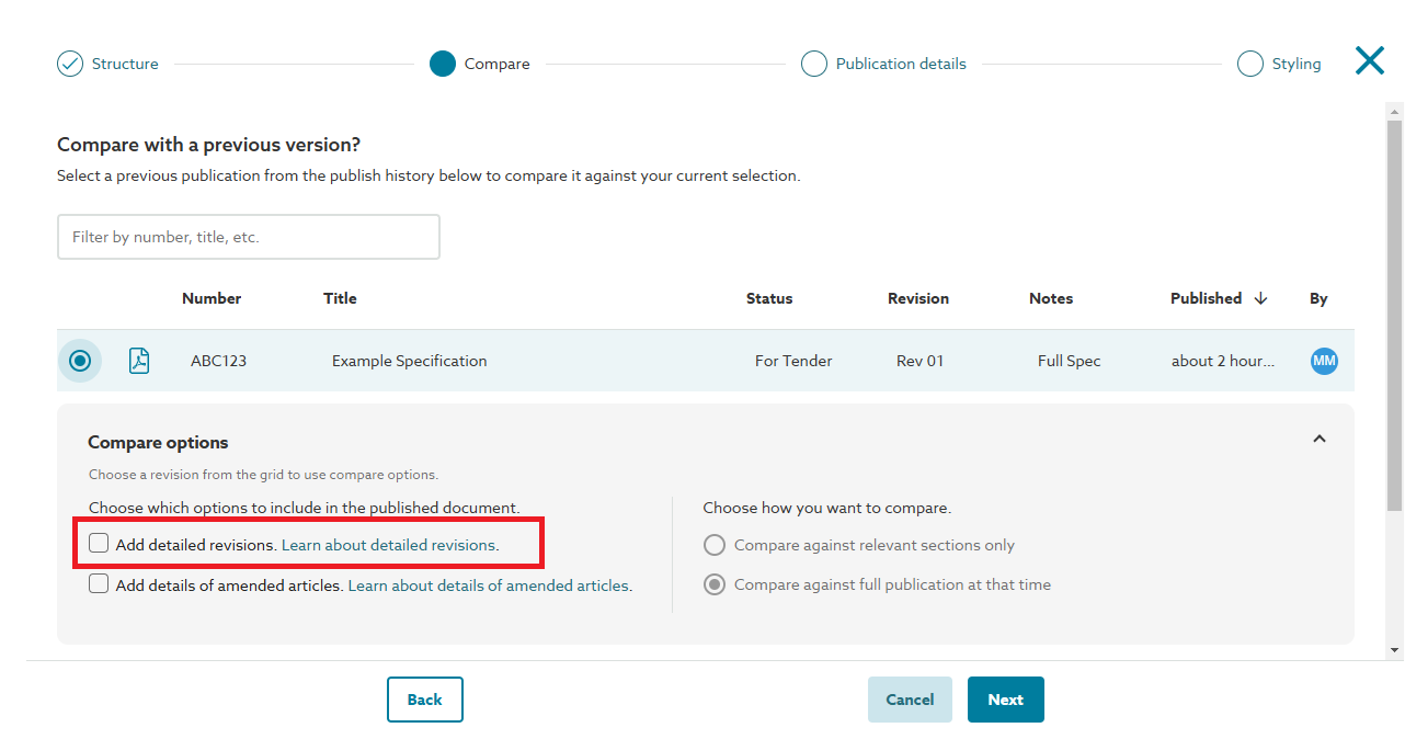 Screenshot showing 'Add detailed revisions' on the 'Compare' step of the publish specification wizard.