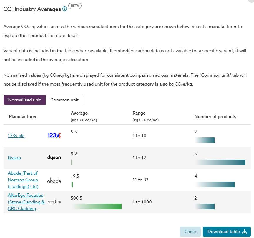 This summary contains industry averages for embodied carbon (calculated from data provided by manufacturers in NBS Source) presented in a table, comparing product categories or subcategories with the average embodied carbon within that category. Also highlighted are the range and number of products in the calculation, as well as the ability to show the normalised values as well as the common unit values for other unit types not in kg CO₂e/kg.