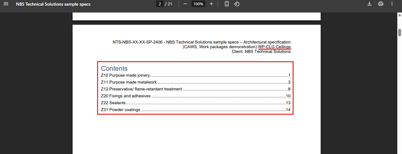A screenshot showing a single section can be assigned with multiple work package tags. - Select the work page tabs you want to publish on the specification 'Contents' tab.