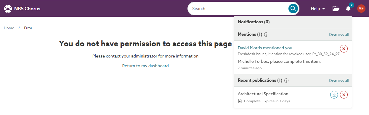 If the revoked user tries to open the mention, they are presented with the 'You do not have permission to access this page' message.