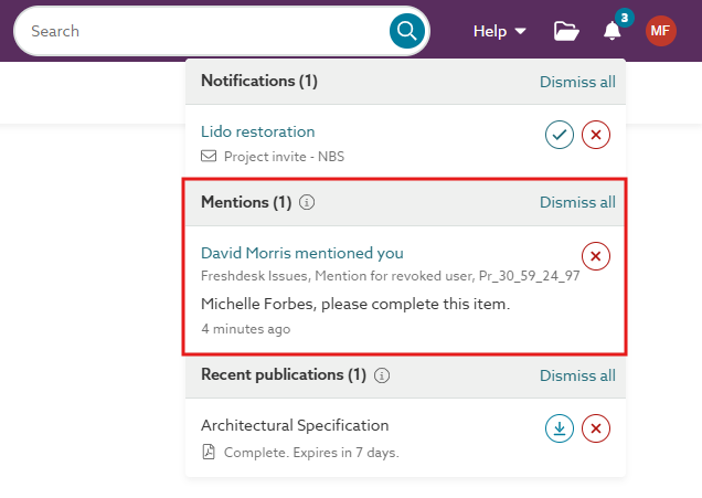 If you revoke a user’s permission to a project or master after mentioning them in a specification, it contain the ‘Mention’ notification as shown as 'revoked'.