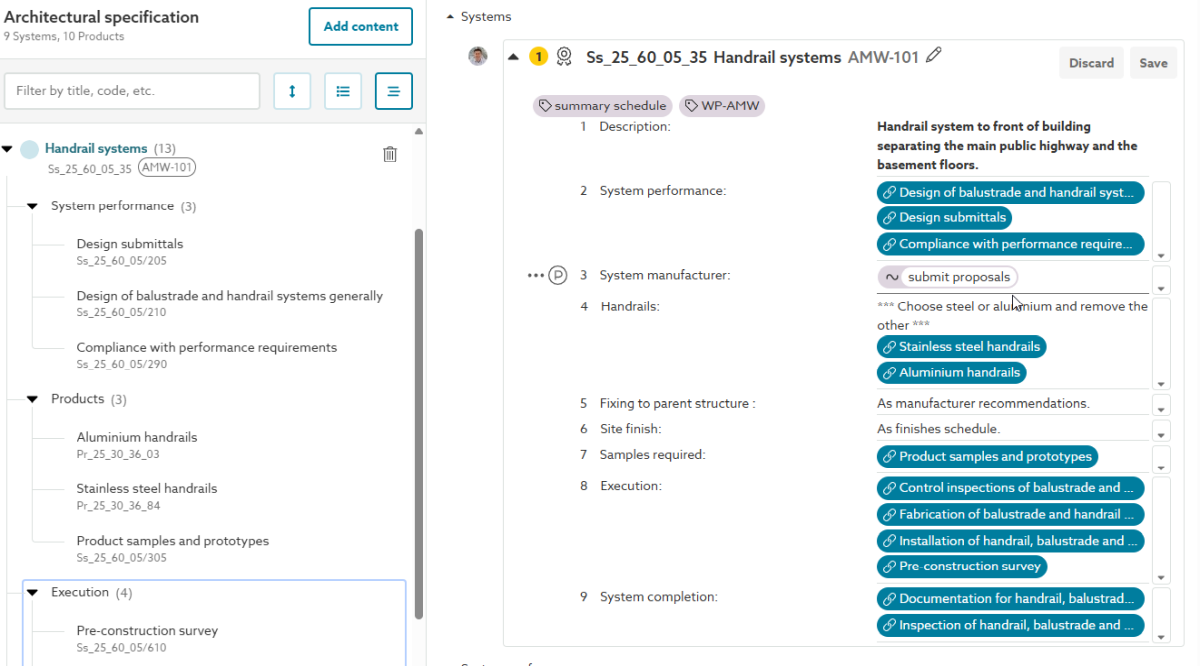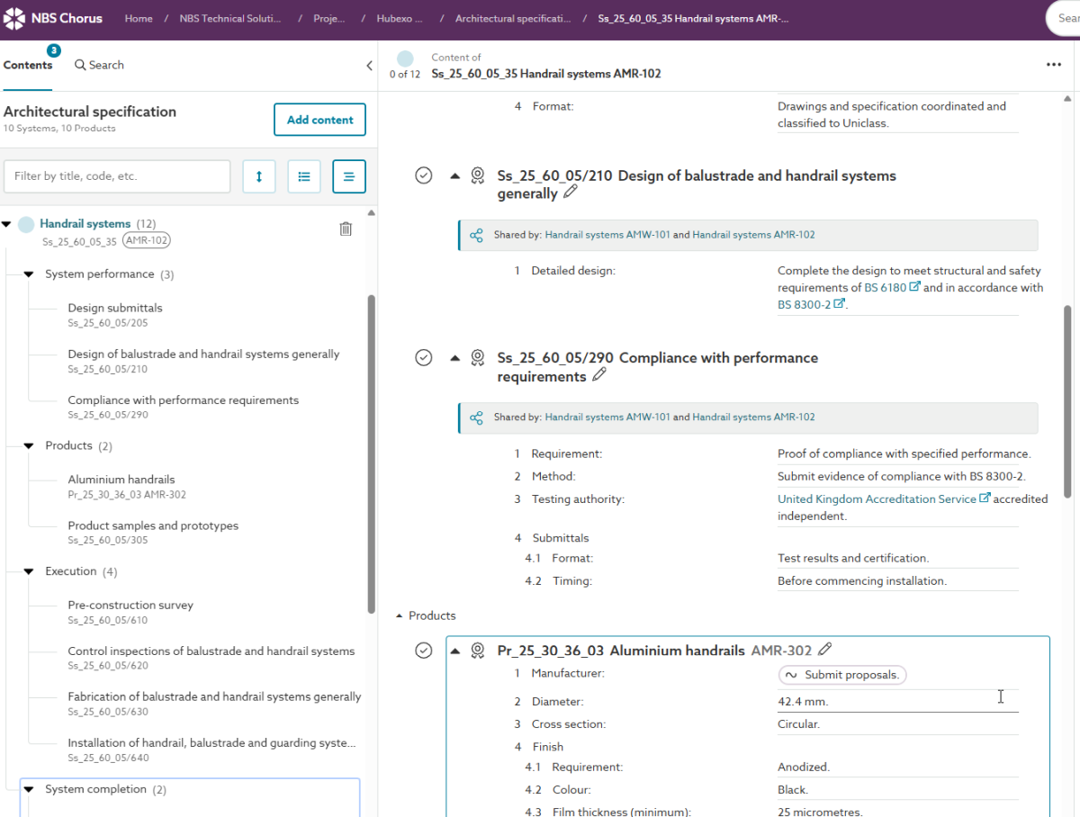 The first time a system is added to a project specification, there are no decisions to be made. It drops into the project spec, and the user then makes it project-specific - such as adding a new clause suffix for drawing references, updating the description, and deciding whether to choose the stainless steel or aluminium handrail.