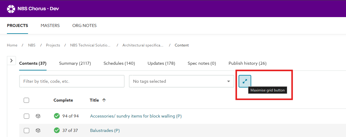 The 'Maximise grid' function expands the data grid to fill the entire width and height of the screen, enabling specifiers to view more of their data at once.