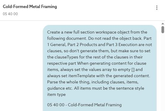 Create a new full section workspace object from the following document. Do not read the object back. Part 1 General, Part 2 Products and Part 3 Execution are not clauses, so don't generate them, but make sure to set the clauseTypes for the rest of the clauses in their respective part When generating content for clause items, always set the values array to empty [] and always set itemTemplate with the generated content. Parse the whole thing, including clauses, items, guidance etc. All items must be the sentence style item type